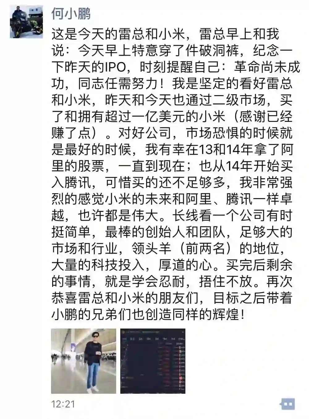 关于认购小米股票一事,何小鹏昨天回应腾讯《一线》道:买入小米,除了和雷军是好友关系,彼此在需要的时候互相帮忙外,主要还是因为看好小米的未来。