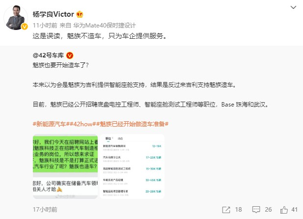 近日,魅族在互联网招聘平台发布了汽车领域岗位招聘,引发网友热议,难道魅族也要造车了?针对造车传闻,魅族回应称:“公司确实在储备汽车领域相关人才”,但这个回答过于模糊,并没有直接回应是否造车。对此,吉利汽车高级副总裁杨学良再次回应,他表示“魅族造车”是误读,魅族不造车,只为车企提供服务。
