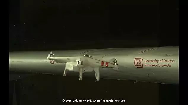 科学家用一门直径12英寸(约30.5cm)、重2800磅(约1260千克)的钢制大炮将重2.1磅(约0.9千克),DJI Phantom 4无人机发射到空中。在不到百分之3秒的时间内,该无人机在空中与飞行速度为238英里每小时、Mooney M20的飞机相撞。无人机上快速旋转的螺旋桨最终撕裂了机翼,损坏了主翼梁。而翼梁是支撑飞机重量的关键部件。无人机也最终解体。