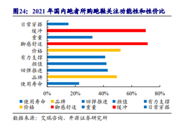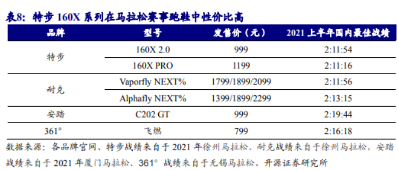 产品力之外,特步跑鞋的高性价比优势也为其增粉不少。根据艾瑞咨询数据,功能性(缓冲、脚感舒适)与性价比是国内跑者最为关注的跑鞋要素。以特步160X系列为例,如图所示,综合售价及马拉松赛事战绩,特步160X系列在高端竞速跑鞋中性价比优势显著。
