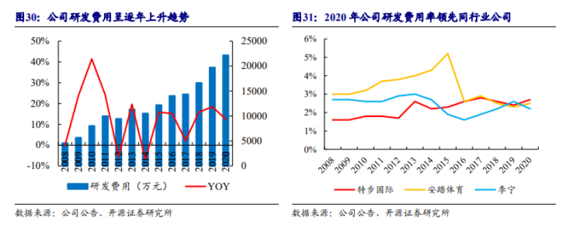 近年来领先于同行的费用投入力度为特步的产品研发提供有力支撑。特步的研