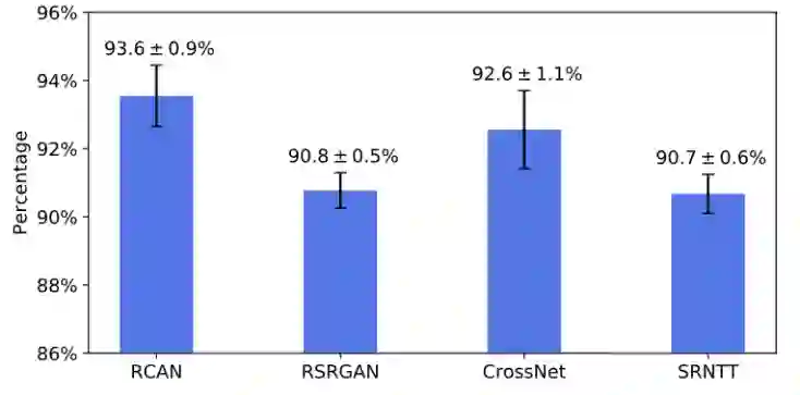 第一项技术是图像超分辨率技术,即从低分辨率图像中恢复出自然、清晰的高分辨率图像。与先前盲猜图片细节的方法不同,我们引入一张高分辨率参考图像来指引整个超分辨率过程。高分辨率参考图像的引入,将图像超分辨率问题由较为困难的纹理恢复/生成转化为了相对简单的纹理搜索与迁移,使得超分辨率结果在指标以及视觉效果上有了显著的提升。