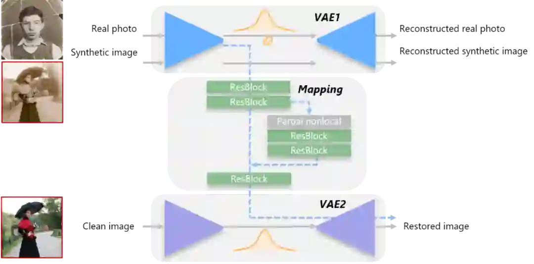 类似的,我们用第二个自编码器 VAE2 得到高质量目标图片的隐空间编码。之后,我们固定两个 VAE 的编解码器,利用合成图片与目标图片的显式配对关系(标识为红色框),学习一个额外的隐空间映射(蓝色虚线),以实现对图片的修复。