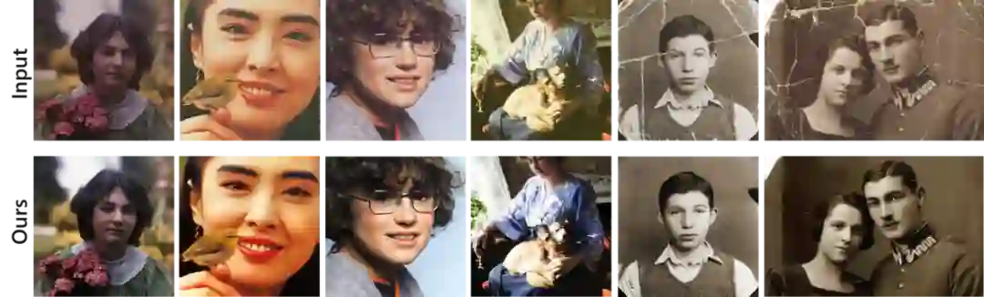 至此,网络可以像修复合成图片一样,高质量的复原实际老照片。在我们的方法中,我们另外抠出照片中人脸部分,在人脸数据集上训练网络进一步优化人脸的细节。