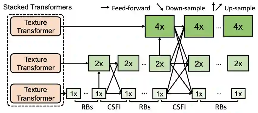 传统 Transformer 通过堆叠使得模型具有更强的表达能力,然而在图像生成问题中,简单的堆叠很难产生很好的效果。因此,本文为了进一步提升模型对参考图像信息的提取和利用,有针对性地提出了跨层级的特征融合机制。我们将所提出的纹理Transformer 应用于 x1、x2、x4 三个不同的层级,并将不同层级间的特征通过上采样或带步长的卷积进行交叉融合。通过上述方式,不同粒度的参考图像信息会渗透到不同的层级,从而使得网络的特征表达能力增强,提高生成图像的质量。