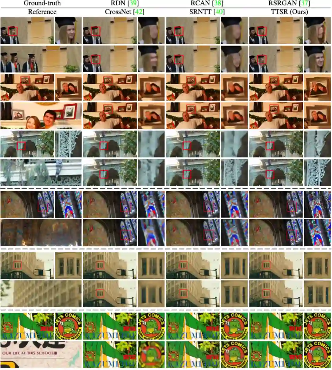 本文在 CUFED5、Sun80、Urban100、Manga109 数据集上针对文中提出的方法(TTSR)进行了量化的比较,具体如表1所示。