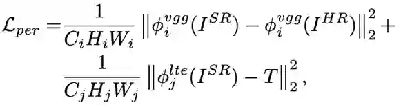 感知损失。感知损失是施加在特定的预训练网络的特征空间中的一种特殊的“重建损失”。本文的感知损失分为两部分,第一部分选取了 VGG 网络作为结果图像与原始图像的特征提取网络;另一部分,选取了文中训练得到的纹理提取器网络作为结果图像的特征提取网络,与迁移特征T进行约束,具体如下式所示: