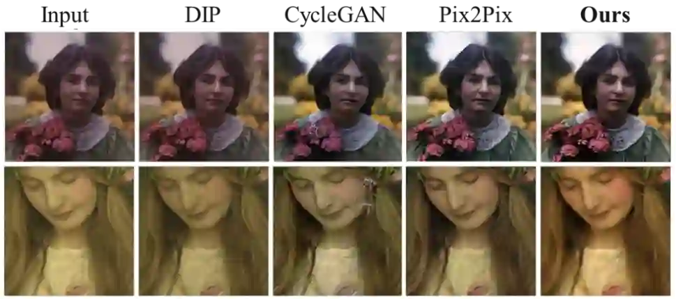 进一步,我们提出老照片修复技术。与其他图片修复任务相比,这是一项更为困难的任务——老照片往往同时含有多种瑕疵,如褶皱、破损、胶片噪声、颜色泛黄,也没有合适的数据集来模拟如此复杂的退化。为此,我们将问题规划为三元域图片翻译,训练得到的模型可以很好地泛化到实际老照片,并取得惊艳的修复效果。