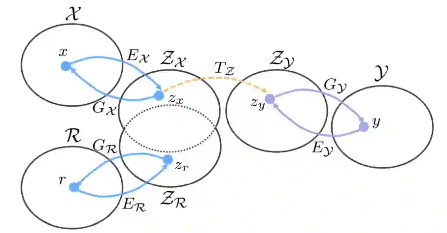 我们采用如图7的网络结构来实现三元域图像翻译。具体地,我们提出用两个变分自编码器(variational autoencoder,VAE)来分别得到两个隐空间 Z_X(≈Z_R)和Z_Y。第一个自编码器(VAE1)学习重建真实图片与合成图片,并在中间用一个对抗学习的判别网络将两种输入的隐空间对齐到同一空间。这里我们采用变分编码器而不是普通的自编码器,这是因为变分编码器假设隐空间满足高斯先验(Gaussian prior),因而图片的隐空间编码更为紧凑,两种输入域的分布更容易被拉近。