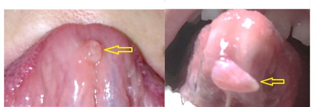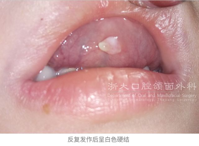 这个“水泡”摸上去软软的很Q弹,颜色有点透白或带点蓝,也不痛,但数天至数周都不能消退。如果不小心咬破它、或有些人以为是水泡而自行戳破,便可见蛋清样的液体流出,“水泡”就消退了。但是,不久后“水泡”又出现了,多次反复后,可能形成白色的硬结。