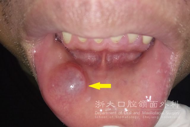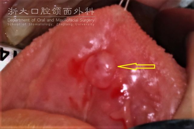 囊肿常呈半透明的小泡,状似水泡,可呈蓝紫色或粉红色,逐渐增大,大多为黄豆至樱桃大小,质地软而有弹性。无痛,但囊肿变大后可影响进食与发音。囊肿易被咬破,流出蛋清样透明黏稠液体,此时囊肿变小或消失。易复发,反复破损后可表现为较厚的白色瘢痕状突起,囊肿透明度降低。另外,囊肿有时也可能长得像血管病变、化脓性肉芽肿、息肉、乳头状瘤。