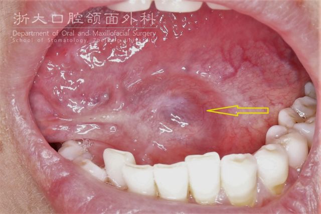 舌下腺管细小,容易因炎症、结石、损伤等因素而引起缩窄、阻塞、分泌物外渗,形成舌下腺囊肿。感觉就像口底起了一个水泡一般的疙瘩,不痛;当疙瘩变大时可将舌头顶起来,可能影响咀嚼,说话含糊不清。水泡呈淡蓝紫色,柔软,用手按压时能感觉到液体在流动,破溃后会有鸡蛋清样黏稠液体流出,有时略带黄色。