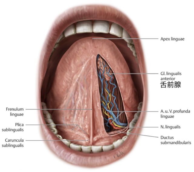 舌前腺是位于舌尖腹面舌系带两侧粘膜下层内的小唾液腺,如下图所示。与其他小黏液腺相比,舌前腺大而深,腺泡呈团块状相连,无包膜,左右对称各一个,中间常靠菲薄的结缔组织相隔,导管开口于舌系带两侧。