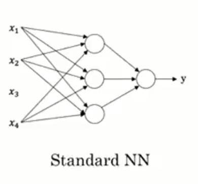 对于更复杂的应用比如自动驾驶,你有一张图片,可能会显示更多的 CNN 卷积神经网络结构,其中的雷达信息是完全不同的,你可能会有一个更定制的,或者一些更复杂的混合的神经网络结构。所以为了更具体地说明什么是标准的 CNN 和 RNN 结构,在文献中你可能见过这样的图片,这是一个标准的神经网络。