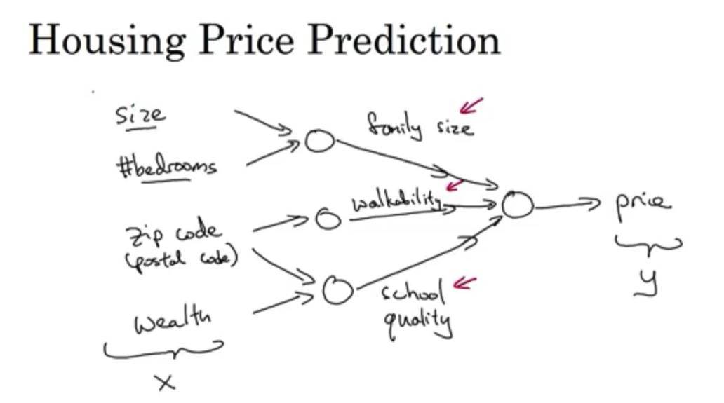 在图上每一个画的小圆圈都可以是 ReLU 的一部分,也就是指修正线性单元,或者其它稍微非线性的函数。基于房屋面积和卧室数量,可以估算家庭人口,基于邮编,可以估测步行化程度或者学校的质量。最后你可能会这样想,这些决定人们乐意花费多少钱。
