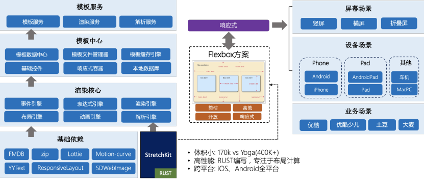 按照分层设计理念共分为4层。基础依赖层坚持最小依赖原则,要重点说明的是,为了保证模板布局计算的高性能,我们引入了由RUST编写的StretchKit高性能布局计算引擎[