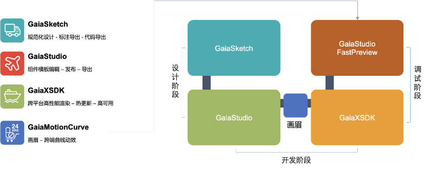 动态模板技术体系以跨端动态化SDK为中心,通过在设计阶段、研发阶段、联调阶段降低对接、开发、调试等核心工作的技术成本,从而真正实现研发提效。目前整个技术方案包括画眉跨平台动效解决方案、智能化设计平台GaiaSketch、跨端模板动态化方案GaiaX、动态模板可视化少代码搭建平台GaiaStudio、辅助调试工具快速预览FastPreview。
