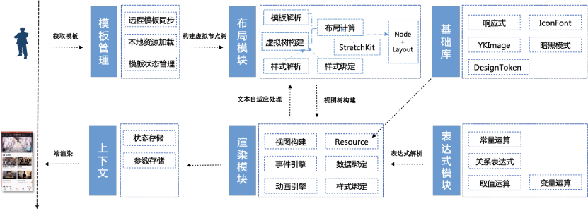 ],其具备跨端、较小的包体积(170K)、计算性能卓越等特点;核心渲染层构成模板引擎的渲染内核,解决模板文件解析、虚拟节点树构建、布局计算、表达式构建解析等核心逻辑;模板中心及模板服务层则面向业务,与优酷业务架构进行结合实现对现有能力的复用,避免重复造轮子,并向上层业务提供标准化模板渲染及接入服务。