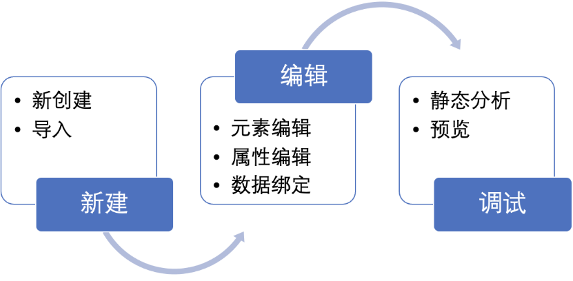 对于一个模板,一般来说我们要进行一组完整的编辑处理,才能完成整个构建工作,包括:基础属性、布局、样式、动画、数据绑定。