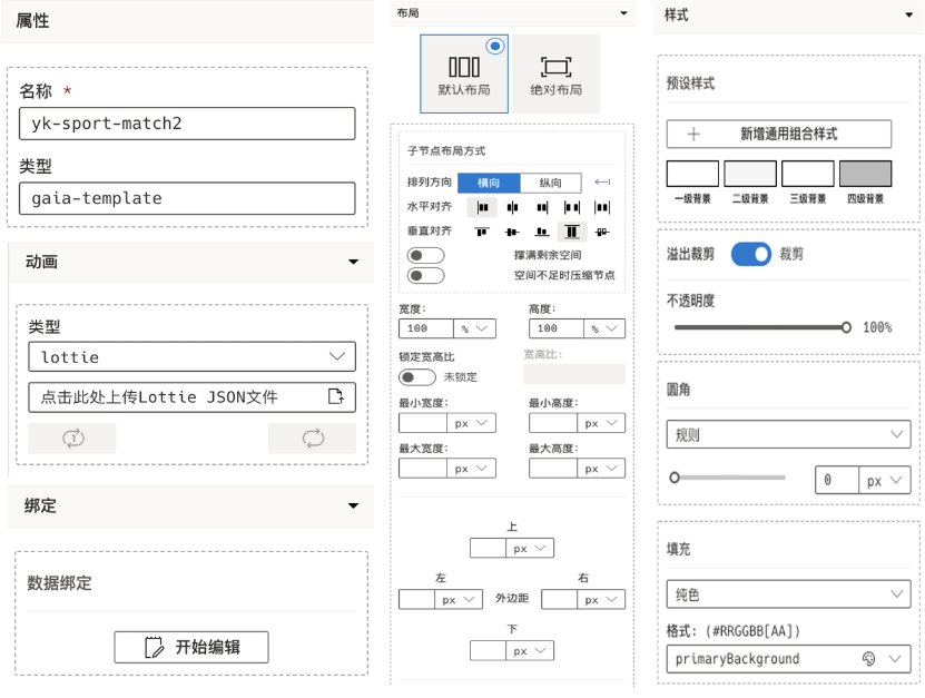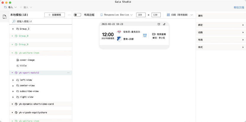 为了解决上述问题,优酷技术团队在动态模板引擎上线后,着手构建了GaiaStudio动态模板低代码IDE。开发者通过该IDE,可以对模板进行可视化搭建,引擎支持的所有布局及样式属性,都在IDE中进行了内置,开发者只需进行选择,便可用户界面中即可得到渲染反馈。