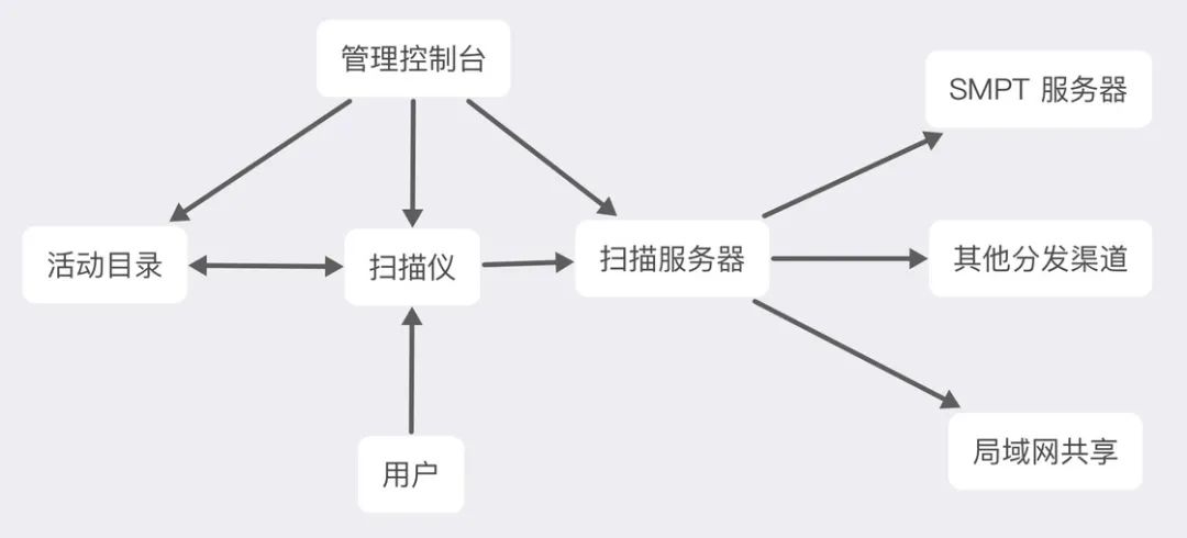 以下面这张流程图为例,扫描管理控制台可以用于检测及控制网络扫描仪,并在活动目录创建扫描进程。网络扫描仪所扫描的电子文档会传输至扫描服务器进行处理,并将其传输到其他服务器(比如局域网共享、SMTP 服务器等)进行文档的分发操作。