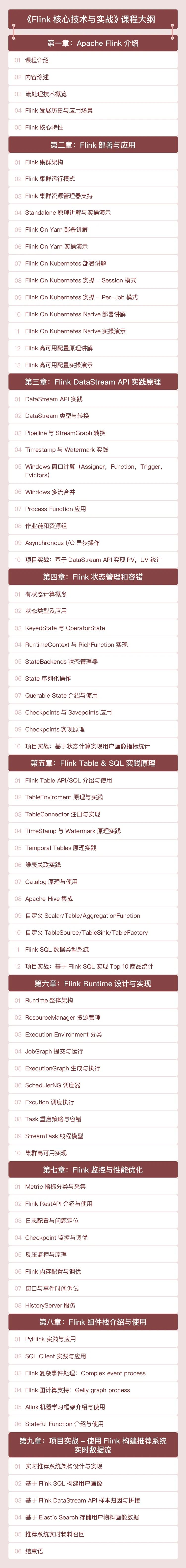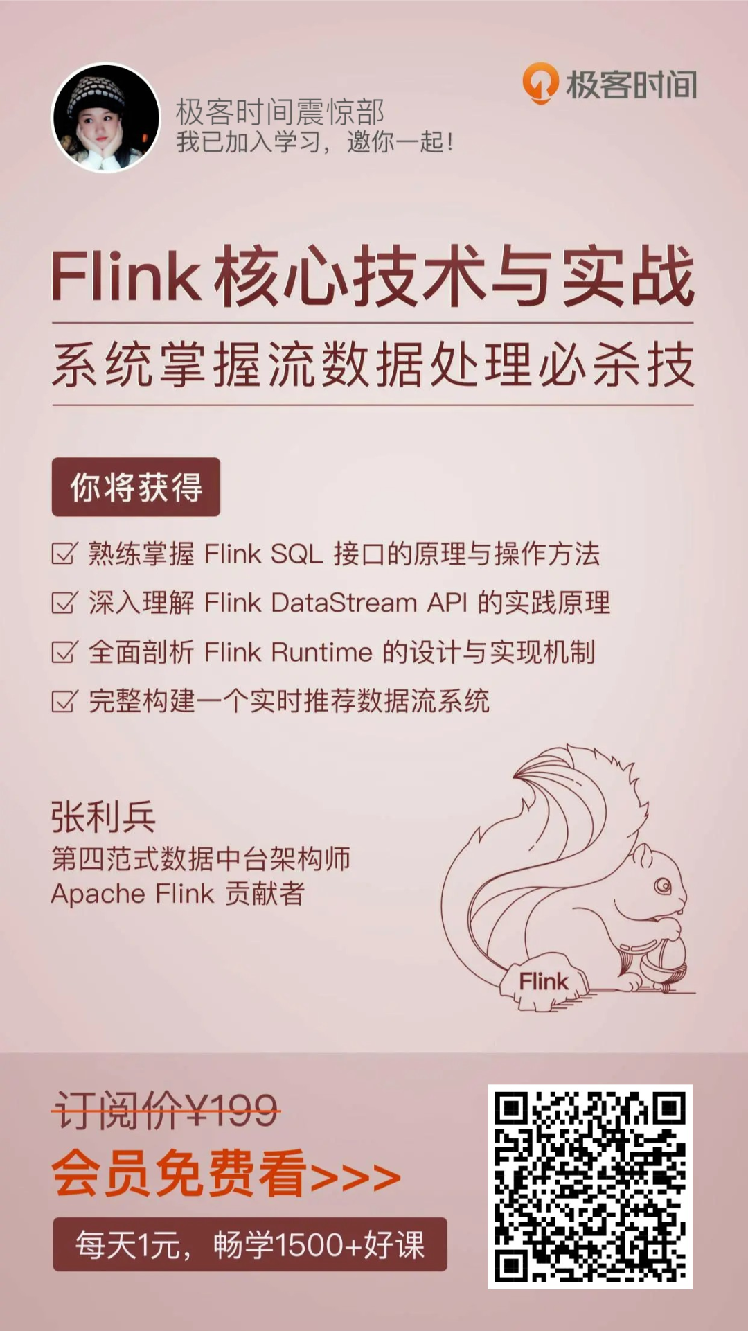 我最近刚看完他写的《Flink 核心技术与实战》视频课,很有启发。总结来说,深入剖析了 Flink Runtime 的设计与实现机制,讲解了 Flink SQL 接口的原理与操作方法,以及 Flink DataStream API 的实践原理,手把手教你构建一个完整的实时推荐数据流系统,让你彻底拿下 Flink。