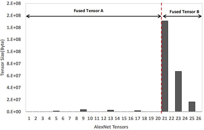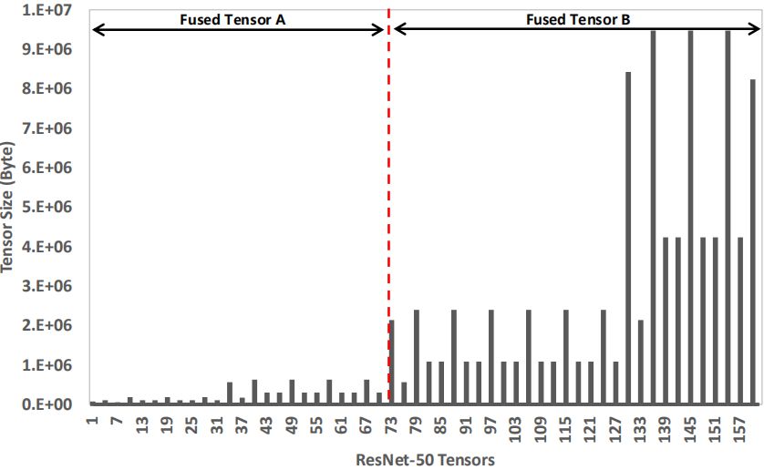 (2) 梯度融合,多次梯度传输合并为一次:根据具体模型设置合适的Tensor size阈值,将多次梯度传输合并为一次,同时超过阈值大小的Tensor不再参与融合;这样可以防止Tensor过度碎片化,从而提升了带宽利用率,降低了传输耗时。