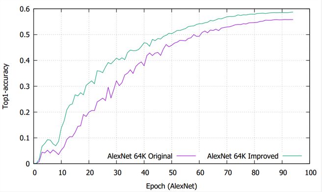 我们在32K下复现了You et al. (2017)的测试结果,但batch size扩展到64K时,训练精度未能达到基准准确性。为了提高在64K下的收敛准确性,我们对参数和模型进行了改进:1) 只对weight做正则化。 2)在You et al. (2017)模型的基础上,进一步改进AlexNet模型。