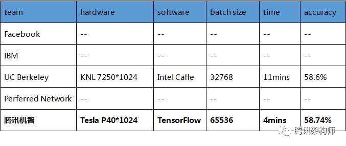 腾讯机智 机器学习平台团队,在ImageNet数据集上,4分钟训练好AlexNet,6.6分钟训练好ResNet-50,创造了AI训练世界新纪录。
