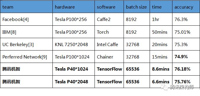 很多研究团队都进行了深入尝试,比如Facebook人工智能实验室与应用机器学习团队可在1小时训练好ImageNet [4];目前业界最好的水平来自: