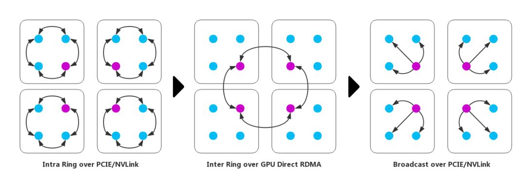 (3) GDR技术加速Ring Allreduce:在前述方案的基础上,将GDR技术应用于跨节点Ring,这减少了主存和显存之间的Copy操作,同时为GPU执行规约计算提供了便利;