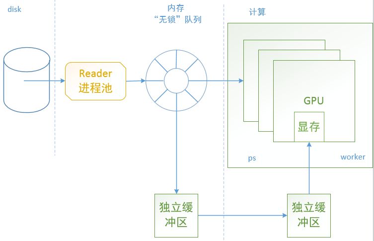 机智团队为解决IO问题,将训练样本集部署在由SSD盘组成的存储系统上,以保证CPU访问数据的带宽不受网络限制;同时,更为关键的是引入了Pipeline机制,该机制将一次训练迭代中的数据读入及处理和模型计算并行起来,在做模型计算的同时做下一轮迭代的数据读取处理并放入自定义“无锁”队列,并通过GPU预取机制提前把处理好的数据从队列中同步到GPU显存中,当做下一轮的模型计算时直接从显存读取数据而不需要再从CPU或磁盘读取,做到将数据读取隐藏,IO和计算并行起来。