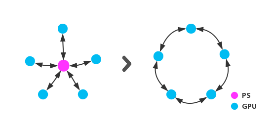 分布式训练数据并行模式下,经典的部署方式是独立的参数服务器(Parameter Server)来做训练过程中梯度的收集、分发和更新工作,每一次迭代所有的GPU都要与PS多次通信来获取、更新参数;当节点超过一定数量时,PS的带宽以及处理能力将成为整个系统的瓶颈。