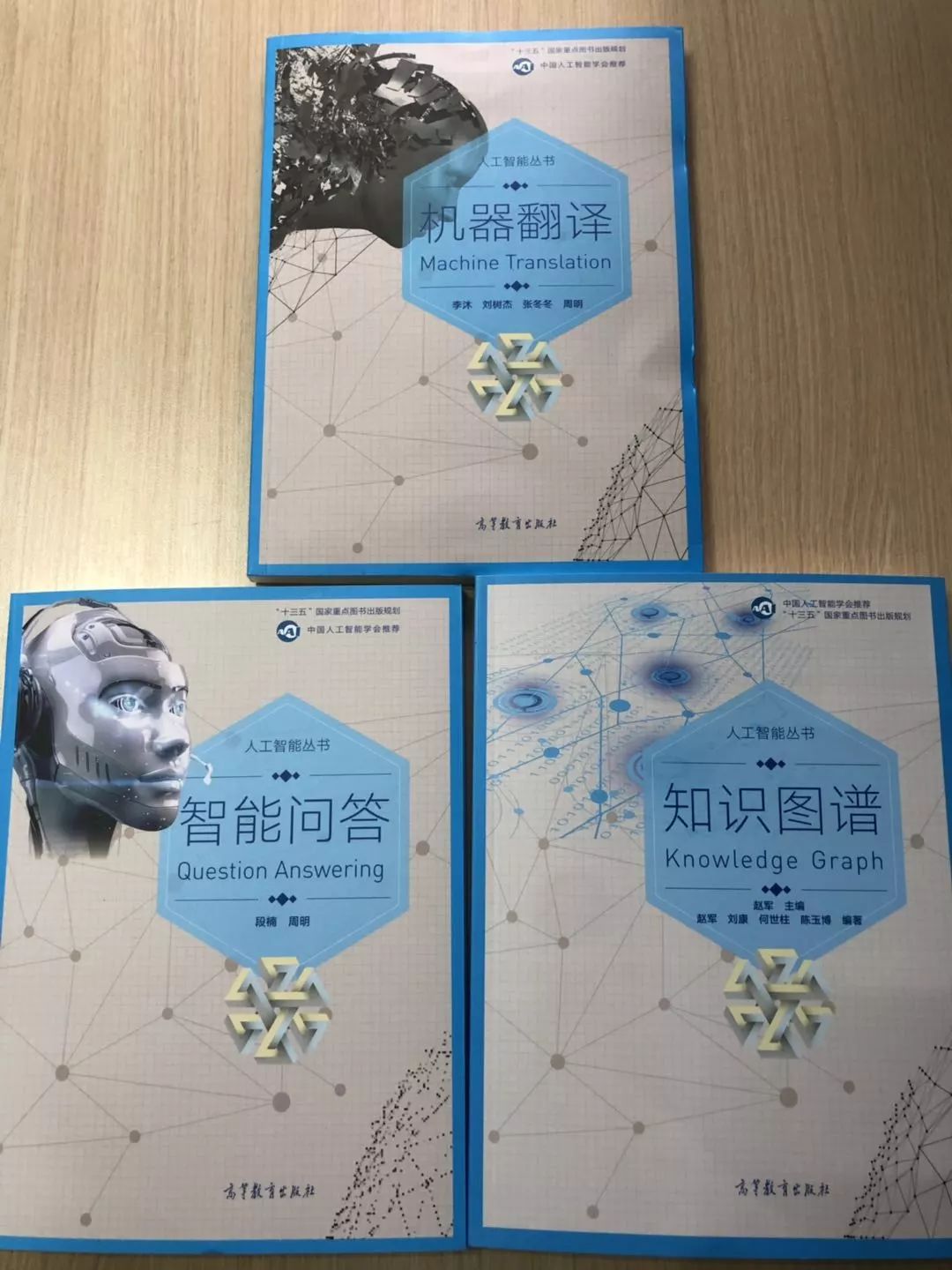 不过趁着春节,看到大家调戏对联机器人的热情高涨,所以想结合这个活动做一期赠书活动,书籍是近期高等教育出版社联合国内人工智能研究机构出版的《机器翻译》、《智能问答》和《知识图谱》三本书籍,前两本来自微软亚洲研究院周明老师研究组、后一本来自自动化所赵军老师研究组,都是NLP研究的热点和难点,也是国内难得的专业书籍,我已购入这三本图书,准备作为假期读物: