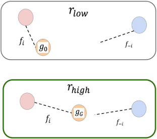 目标评估简图。在模拟轨迹的终点,智能体(红色的在左侧,蓝色的在右侧)之间的距离较远(如上图显示)或较近(如下图显示)。下方图片所显示的目标优于上方图片所显示的目标,因为智能体之间最终的距离比较近