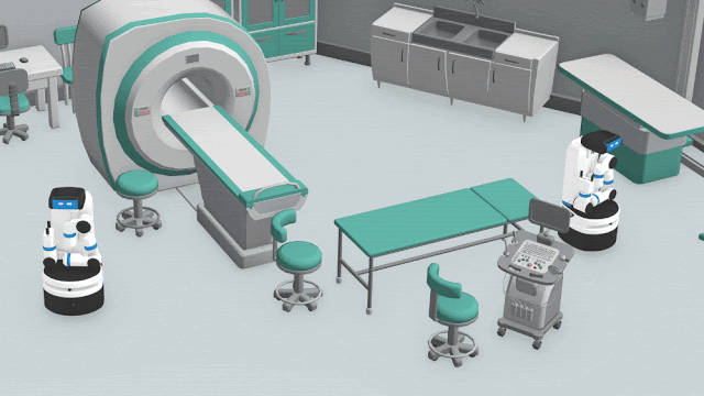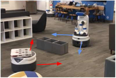 示例:两个独立控制的机器人被障碍物隔开,其共同目标是与彼此会合。这两个机器人如何移动才能会合?每个机器人的示例轨迹分别以红色和蓝色箭头表示。每个机器人根据自己的观察结果独立决定前进的方向