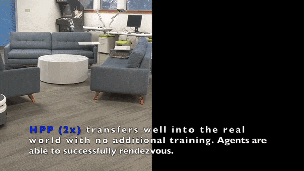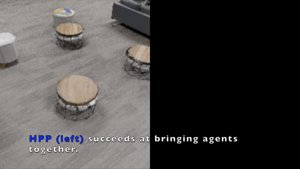 我们在实际环境和虚拟环境的混合条件下将 HPP 与多个基准进行比较,包括 MADDPG(基于学习)、带有 CEM 的 RRT(规划),以及使用启发式算法选择智能体会合点的集中式基准。