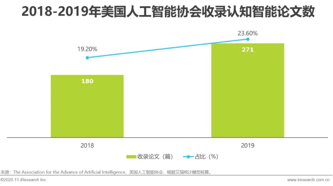 当人们能使用机器识别更多事物,自然而然地引发了对事物的理解和分析等深层次的自动化知识服务的需求,而需要外部知识、逻辑推理或者领域迁移的认知智能领域还处于初级阶段。学界已经展开认知智能领域的研究,2018年以来,美国人工智能协会收录关于认知智能层面的论文逐年增多,占所有收录论文的比重也有提升。