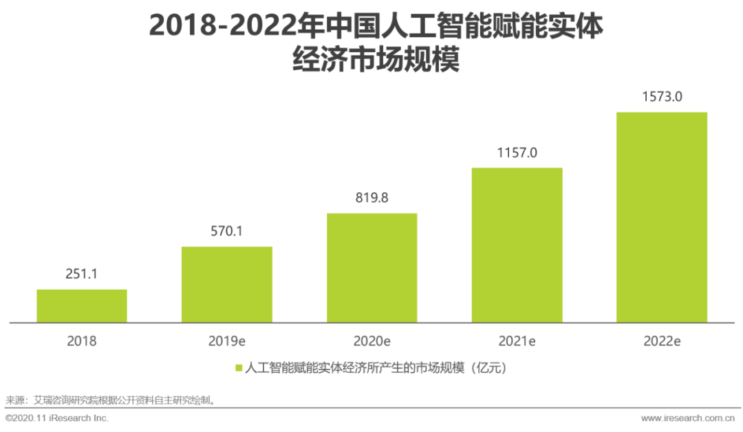 在新基建的三大领域中,两大领域都直接提及人工智能。在信息基础设施领域,人工智能与云计算、区块链一起被视为一种新技术基础设施;而在融合基础设施领域中,人工智能则被视为支撑传统基础设施转型升级的重要工具。人工智能新基建的本质不仅仅指向其自身的产业化发展,更是在实体经济中寻找应用场景,赋能生产力升级,即作为重大应用基础设施,推动各行业完成智能化转型,实现新旧动能的转换。艾瑞咨询测算,2019年人工智能赋能实体经济产生的市场规模超过570亿元。