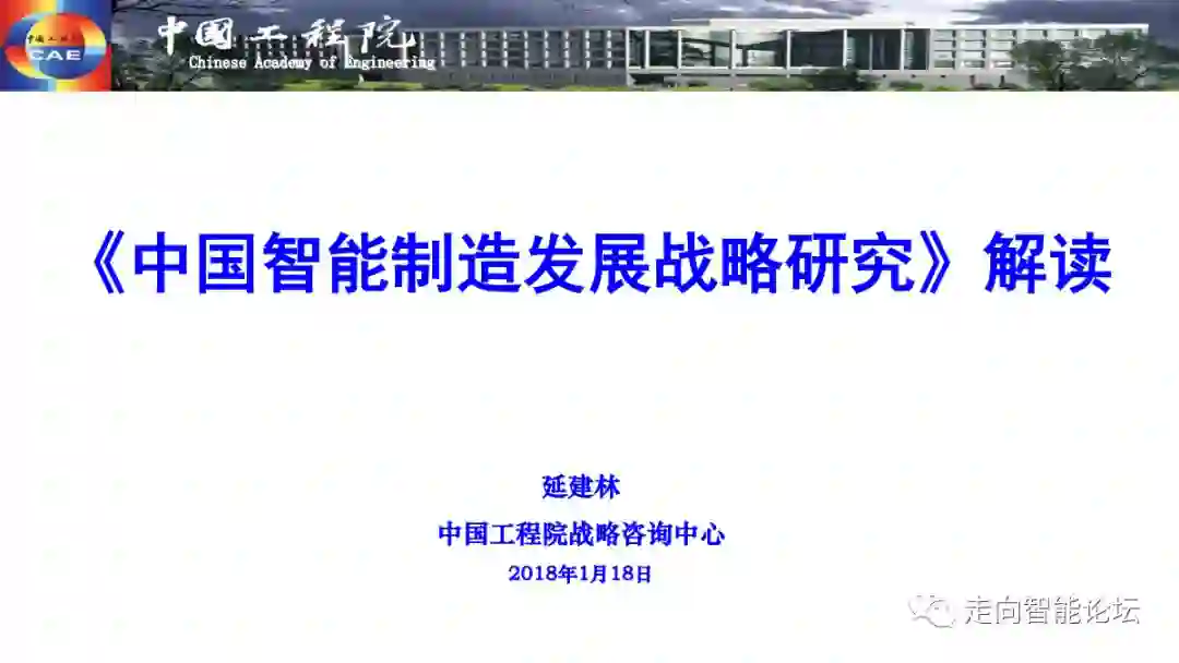 近日,在2018中国智能制造百人会年会上,中国工程院战略咨询中心处长延建林解读了《中国智能制造发展战略研究》,以下为演讲PPT,经作者授权发布,供大家学习交流。