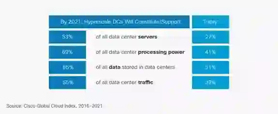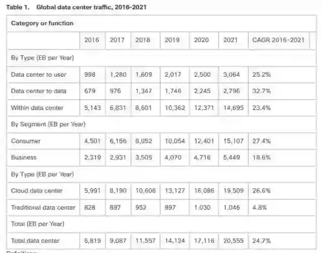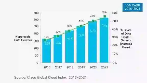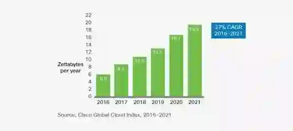 在报告中预测在2021年全球云数据中心流量年流量将达到19.5ZB,而在2016年这个数字仅仅为6.0ZB(1ZB等于10亿TB)。2016年云数据中心流量占总数据中心流量的88%,而在2021年这个数字有望攀升至95%。
