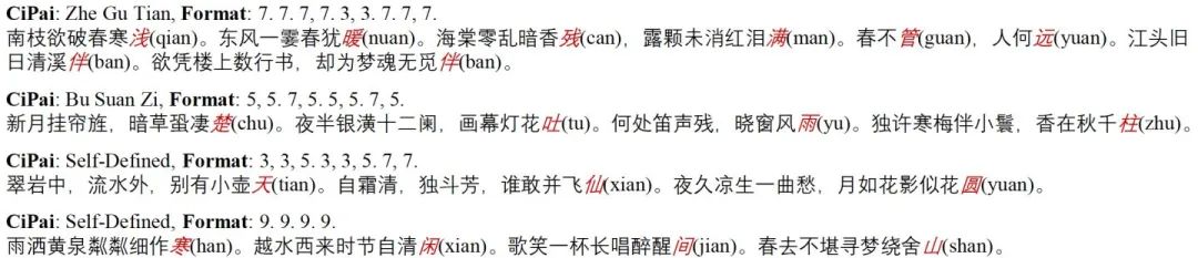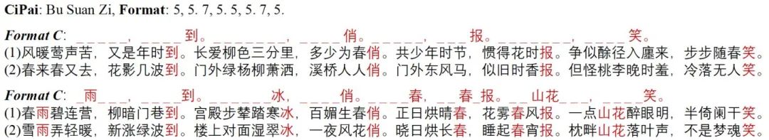 例子中模型不仅可以根据已有的格式模板(例如鹧鸪天、卜算子)进行生成,还能根据我们自己定义的格式进行宋词生成,而且押韵效果也不错。