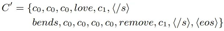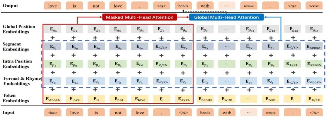 其中代表普通文本符号,代表该位置是韵脚,代表标点符号。如此设计的目的是让模型在读模板的时候,碰到的时候能推测出该处是结尾词、韵脚词,遇到的时候能够知道该输出一个标点符号(也可以保留模板中的标点符号不做改写)。