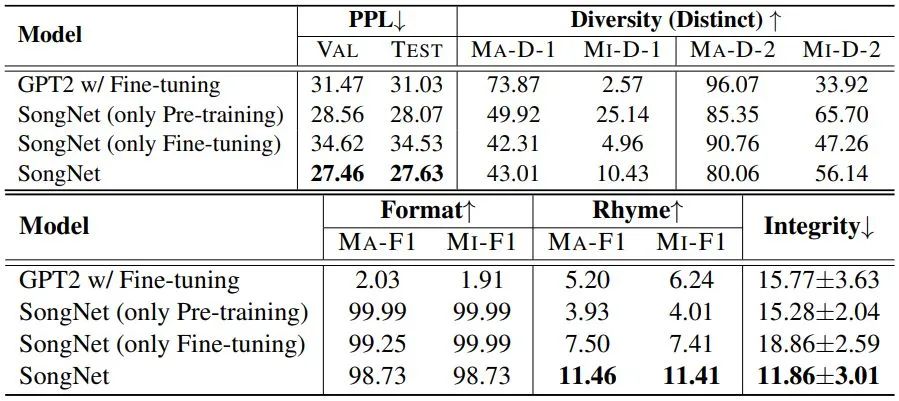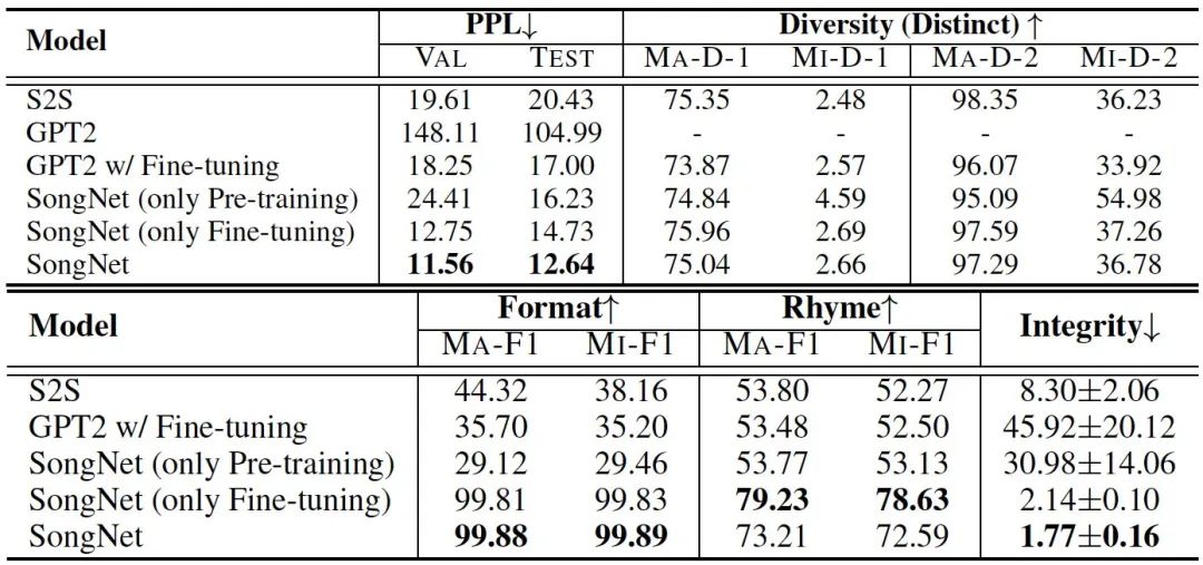 除了常用的文本生成评测指标如ppl、distinct外,我们还专门设计了度量模板准确率(Format)、韵律准确率(Rhyme)和句子完整度(integrity)的指标。