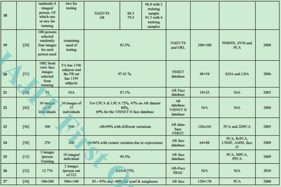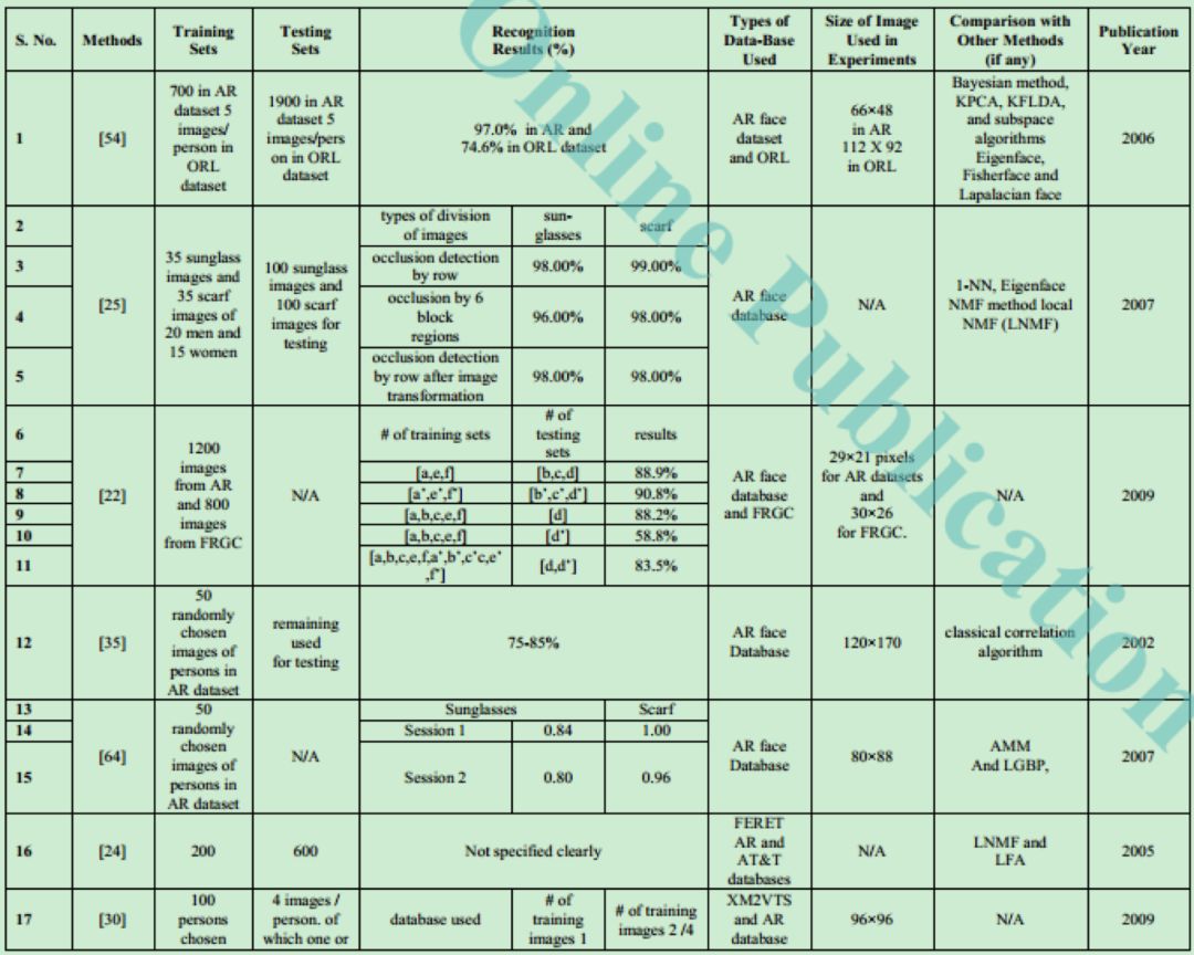 在回顾了不同的方法之后,得出的结论是大部分的工作是在基于部分的方法下进行的。这些方法通过把图像分割为不重叠的子块进而把图像转换到子空间中,然后使用合适的子空间约简技术。确切的说这些方法是PCA,ICA,NMF和LNMF等。同时基于特征的方法包括Ada-Boost 和基于SVM的方法。很少使用基于分形的方法来处理部分遮挡问题。在上面的内容中,主要关注的是人脸识别中的部分遮挡问题并讨论了大量的来自不同研究者的方法。下表给出了上面讨论的技术