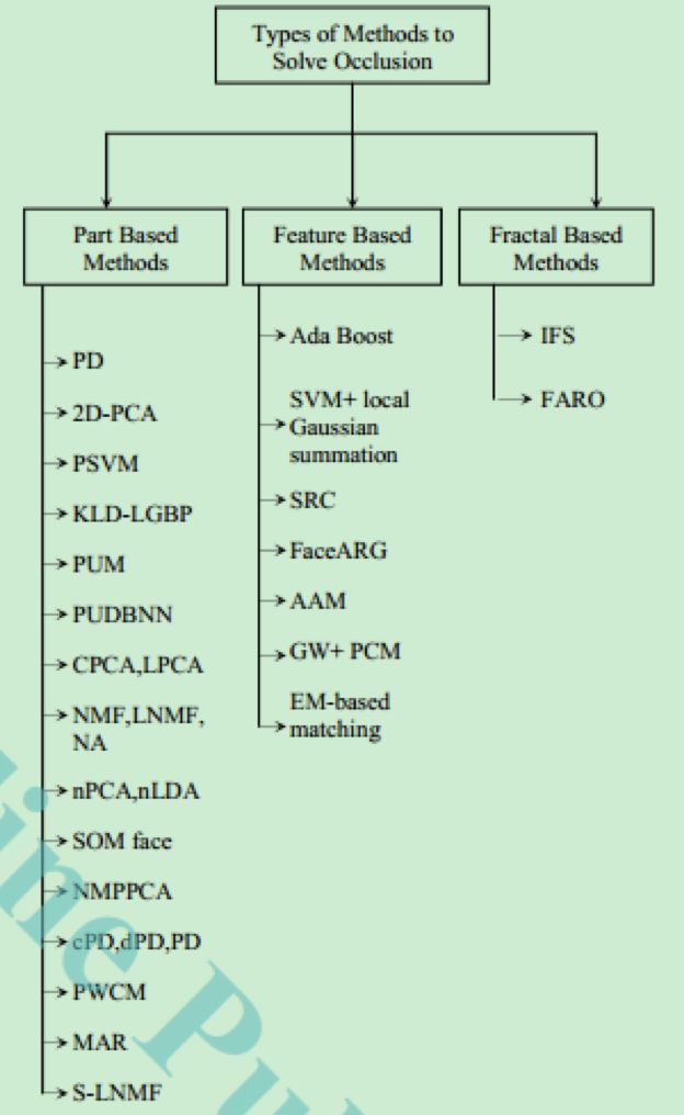 本次技术对部分遮挡的人脸识别问题进行了分类。1)其中基于部分的方法主要有主成分分析(PCA),线性判别分析(LDA),非负矩阵分解(NMF),局部非负矩阵分解(LNMF),独立成分分析(ICA)等;2)基于特征和基于分形的方法考虑了眼睛,鼻子,嘴巴周围的特征然后用于算法的识别阶段。