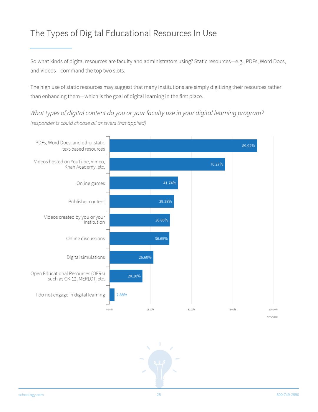 目前为止,最常使用的教学资源仍然是静态的,也就意味着是没有互动的、单向的信息(PDF、Word、视频等)。说明学校只是将传统学习内容电子化而非进行彻底提高。