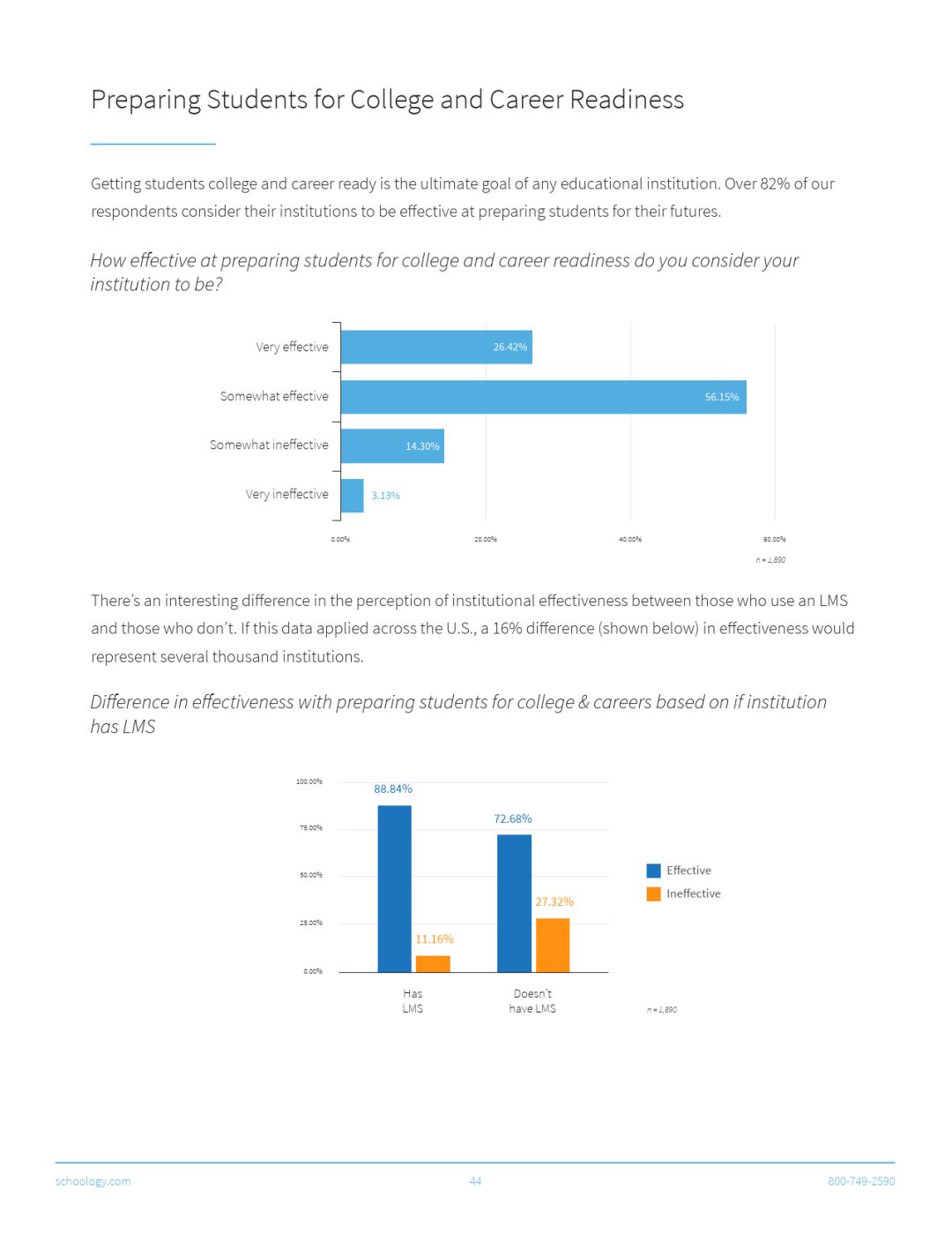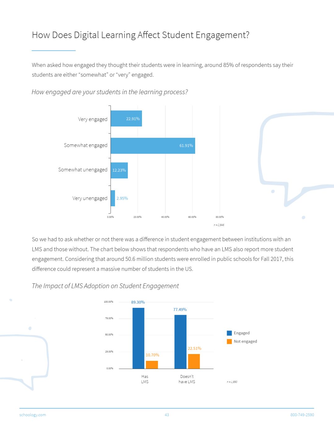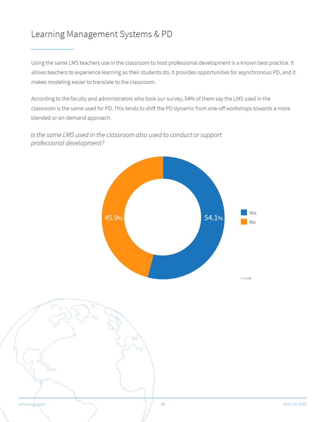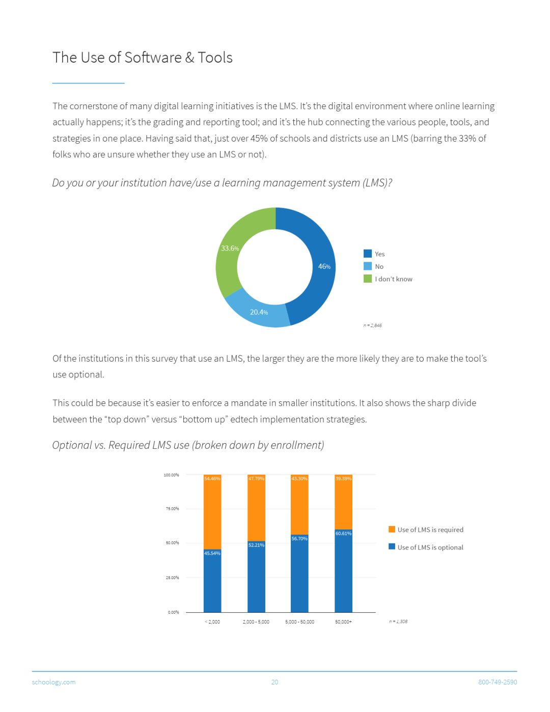 所以在2846名教育从业者的调查中,46%的人说他们有一个LMS系统,20%的人说没有系统。33%的人说他们不确定(这个疑问可能来源于受调查人群中相当大一部分人并非教学人员)。而交叉分析的结果显示,那些说自己有LMS系统的人,学生的参与度也更高。