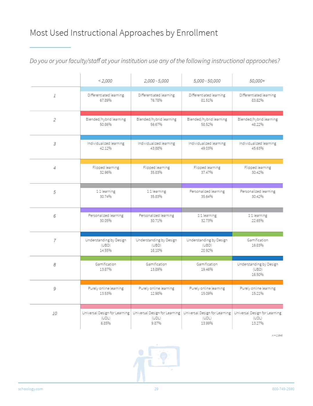 数字化学习的形式很多——从简单的混合式学习到复杂的、需要精通的学习。但是有一些教学形式的使用率更高。下面是我们根据调查结果描绘的教学方法图表。