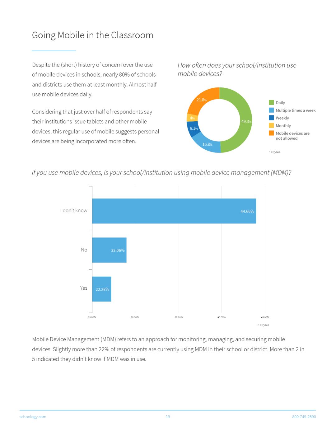50%的受访者表示,他们在课堂上每天都会使用移动设备,而只有22%的受访者表示课堂不能使用移动设备。